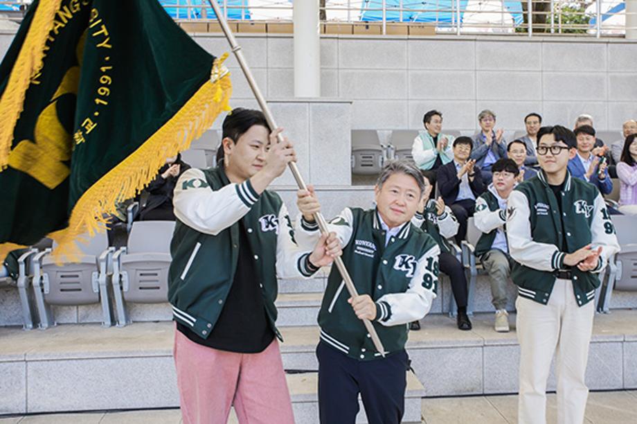 5일 열린 건양대 한솔체육대회 개막식에서 건양대 김용하 총장(오른쪽)과 민대원 총학생회장이 개막을 알리는 모습.jpg