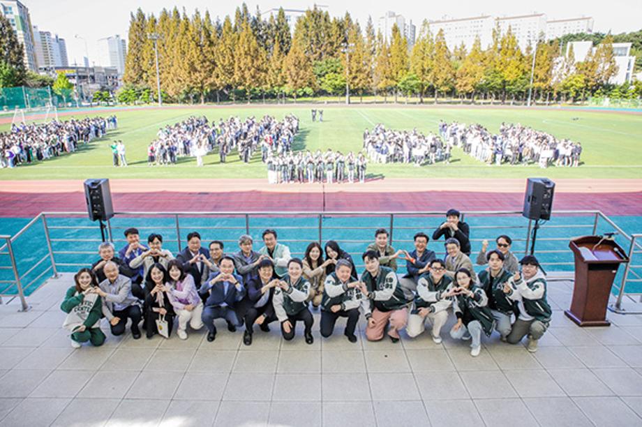 5일 열린 건양대 한솔체육대회 개막식에서 김용하 총장을 포함한 대학 보직교수 및 총학생회, 참여학생들이 단체사진을 찍는 모습.jpg