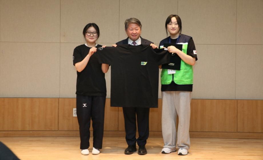 해외봉사단 티셔츠 제작 관련 김용하 총장이 학생들과 기념사진을 찍는 모습.jpg