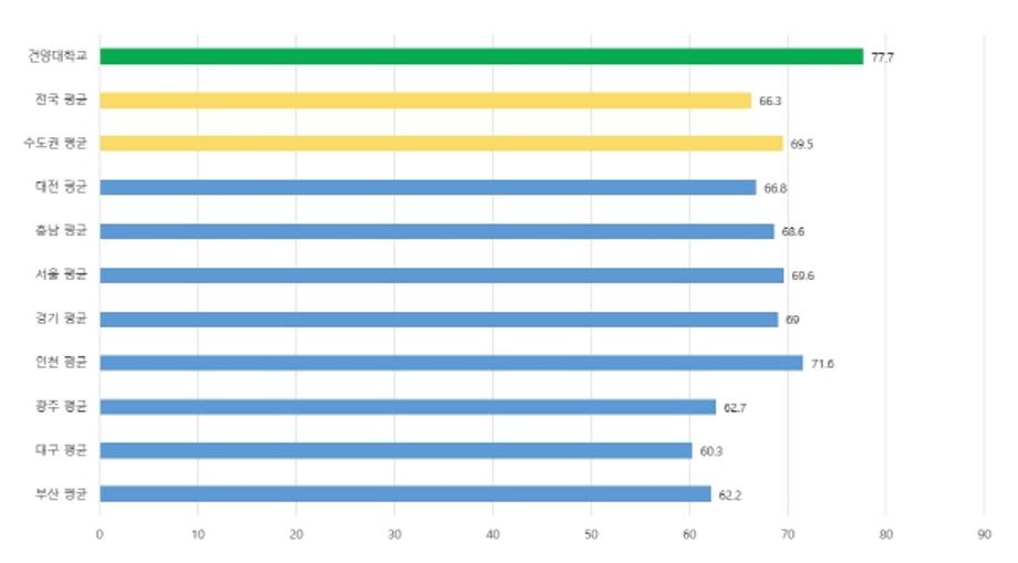 이번 건양대가 기록한 77.7%의 취업률은 건양대 최근 5년 내 취업률 중 가장 높은 수치이자 2022년 전국 4년제 대학 평균 66.3%, 수도권 4년제 대학 평균 69.5%보다 8.2%p~11.4%p나 높은 수치를 보이는 전국 최상위권이다.