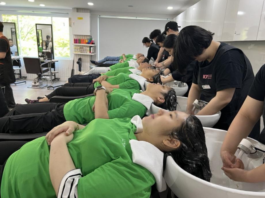 5월31일 건양대 글로벌의료뷰티학과 학생이 논산발그래일터 청년직원에게 두피마사지 및 샴푸봉사를 하는 모습.jpg