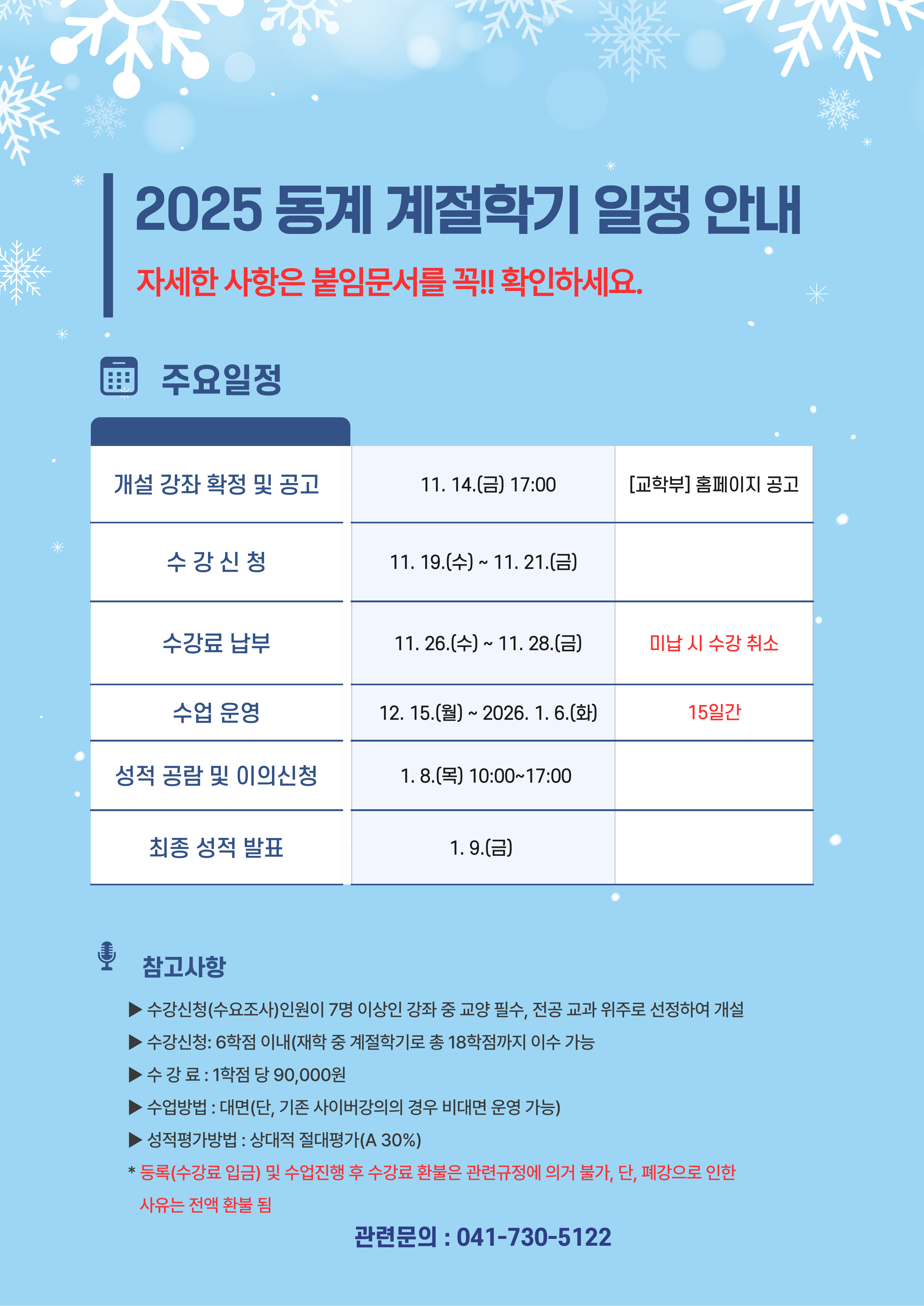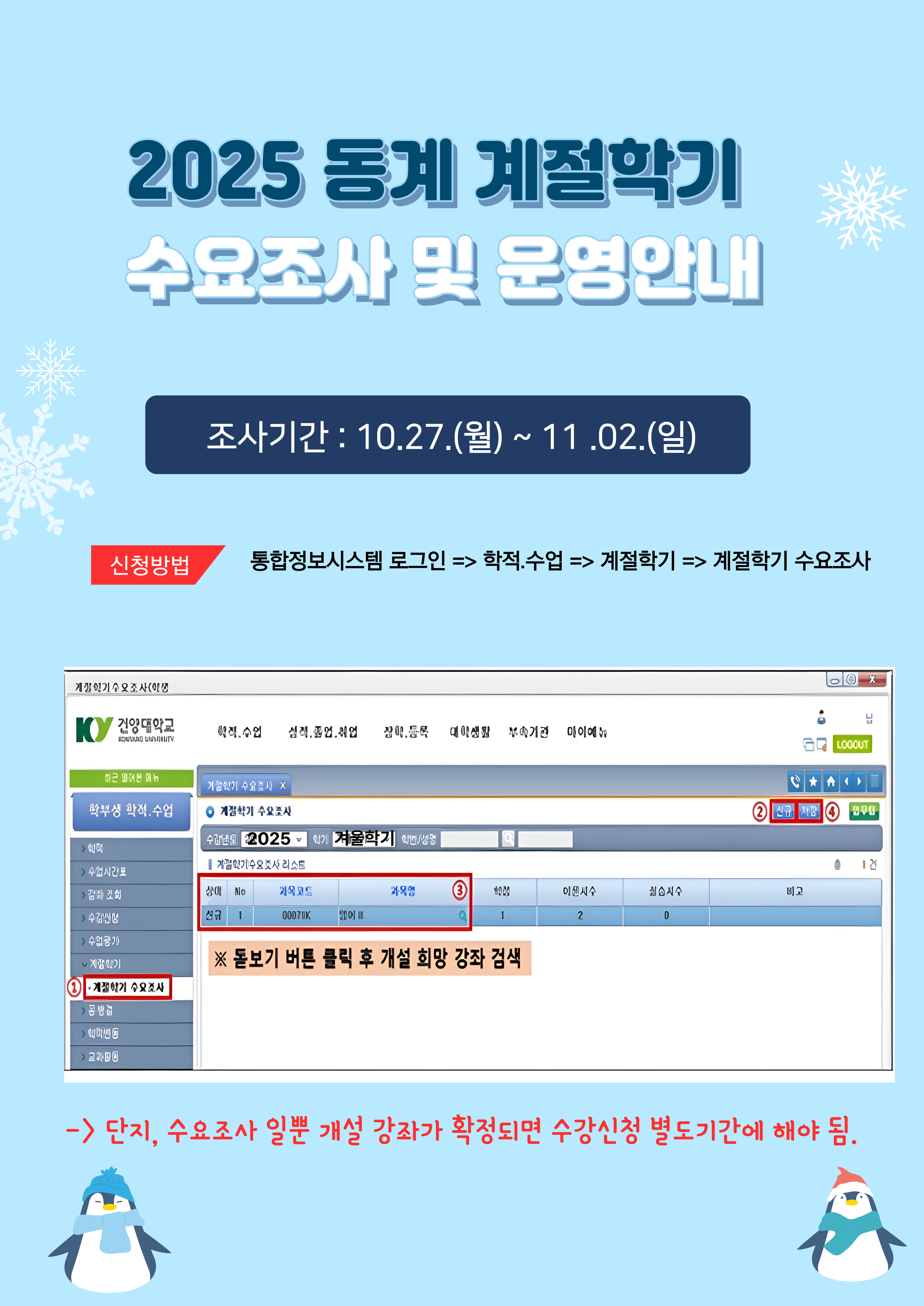 『 2025학년도 동계 계절학기 수요조사 및 운영안내 』글의 상세내용을 확인하는 표로 제목, 부서명, 등록일, 조회, 첨부, 내용으로 나뉘어 설명합니다.